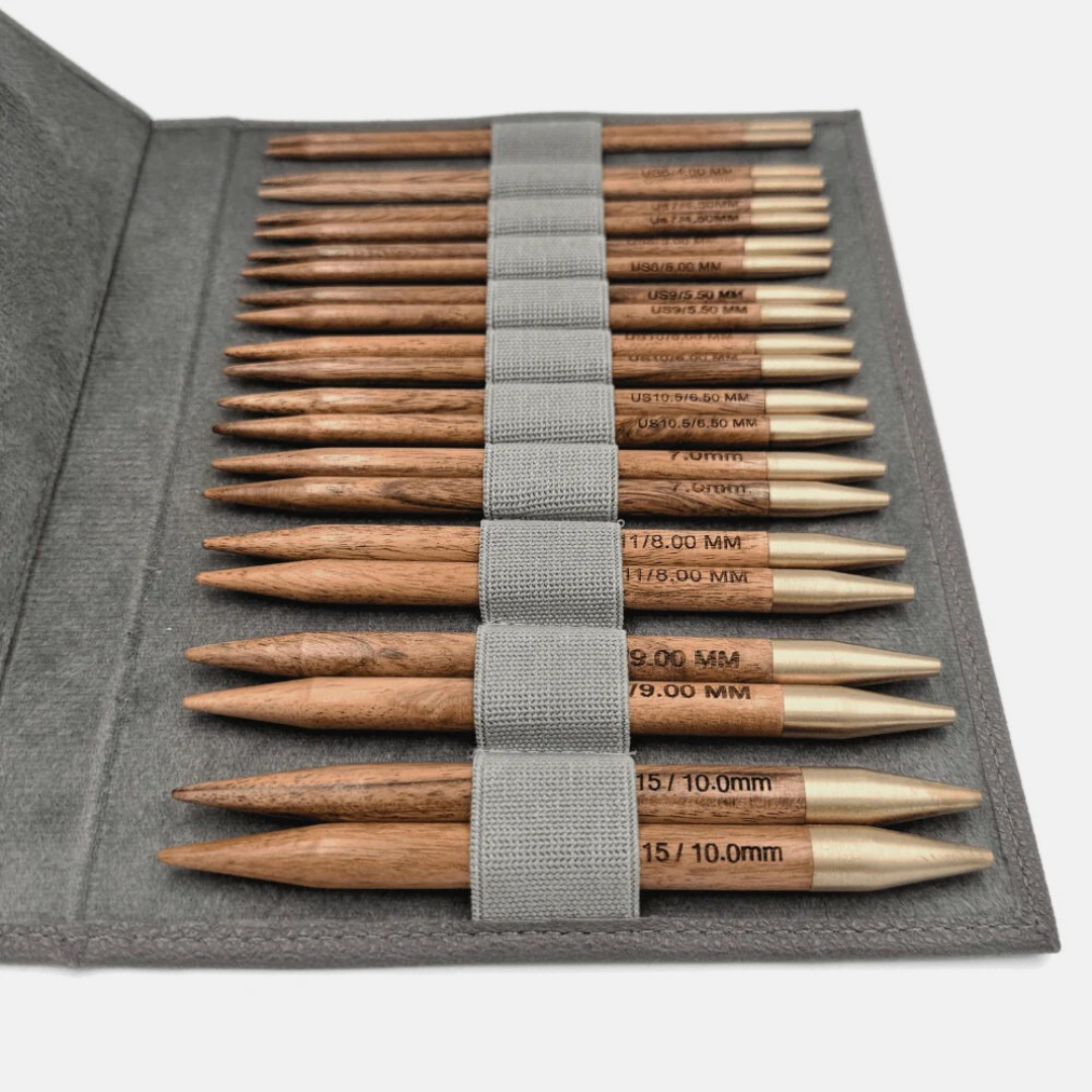 Gaia Garns Udskiftelige Rundpindesæt Aurora er et luksuriøst valg for den kvalitetsbevidste strikker. Med pinde fremstillet af smukt akacietræ, deformationsfri wirer med 360 graders rotationsled og kompatibilitet med KnitPro-gevind får du et sæt, der kombinerer æstetik, funktionalitet og holdbarhed.